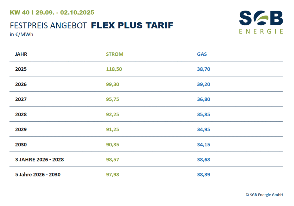 Wir freuen uns, Ihnen unseren aktuellen Festpreis-Wochenreport für die FLEX PLUS Tarife präsentieren zu dürfen. Der Report bietet einen transparenten Überblick über die Preisentwicklung und zeigt auf, wie sich unser Angebot aktuell im Marktumfeld positioniert.