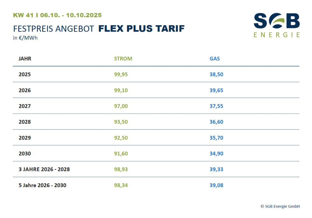 Wir freuen uns, Ihnen unseren aktuellen Festpreis-Wochenreport für die FLEX PLUS Tarife präsentieren zu dürfen. Der Report bietet einen transparenten Überblick über die Preisentwicklung und zeigt auf, wie sich unser Angebot aktuell im Marktumfeld positioniert.