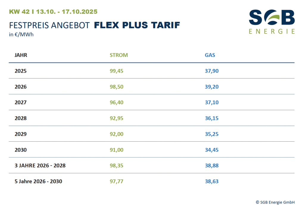 Wir freuen uns, Ihnen unseren aktuellen Festpreis-Wochenreport für die FLEX PLUS Tarife präsentieren zu dürfen. Der Report bietet einen transparenten Überblick über die Preisentwicklung und zeigt auf, wie sich unser Angebot aktuell im Marktumfeld positioniert.