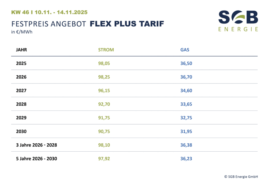 Wir freuen uns, Ihnen unseren aktuellen Festpreis-Wochenreport für die FLEX PLUS Tarife präsentieren zu dürfen. Der Report bietet einen transparenten Überblick über die Preisentwicklung und zeigt auf, wie sich unser Angebot aktuell im Marktumfeld positioniert.