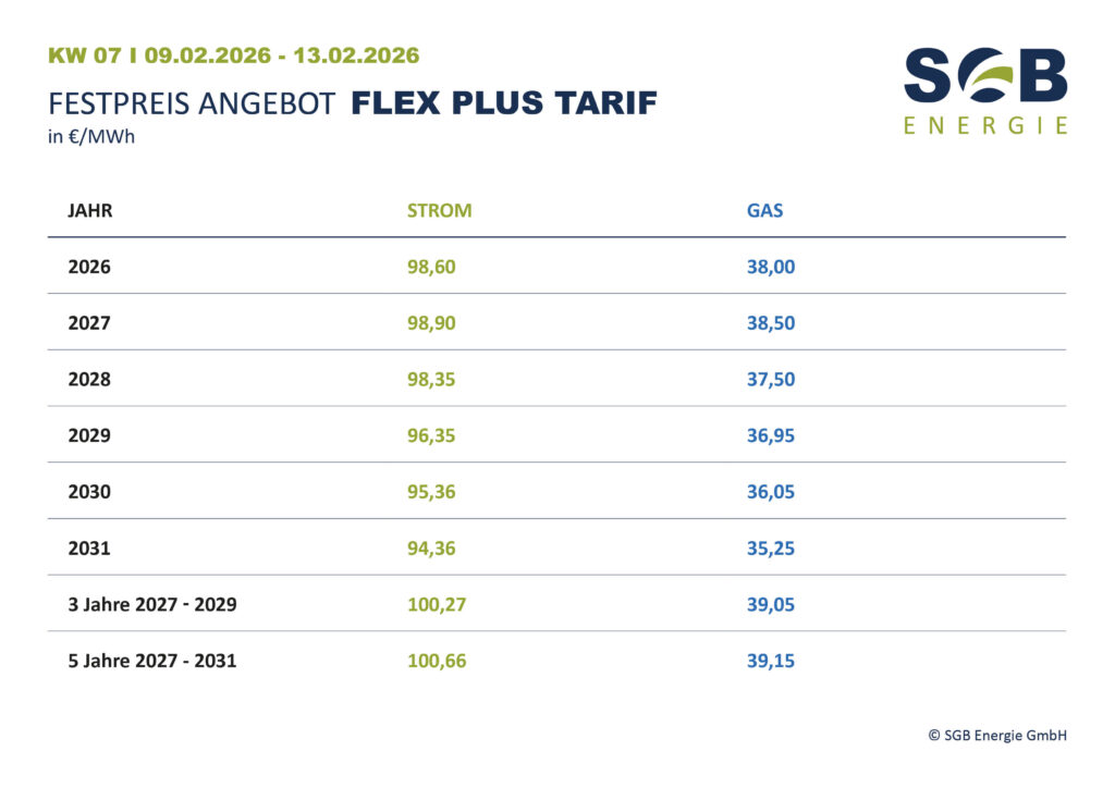 Wir freuen uns, Ihnen unseren aktuellen Festpreis-Wochenreport für die FLEX PLUS Tarife präsentieren zu dürfen. Der Report bietet einen transparenten Überblick über die Preisentwicklung und zeigt auf, wie sich unser Angebot aktuell im Marktumfeld positioniert.